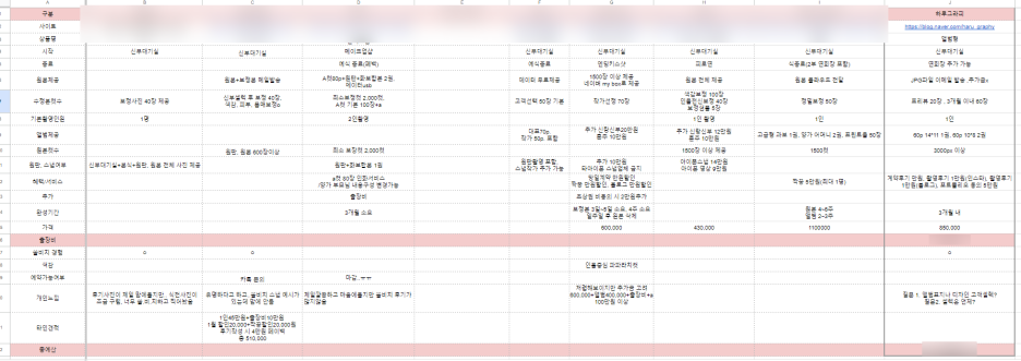 정리한 표에서는 9군데의 본식스냅업체를 알아본 것으로 보이겠지만