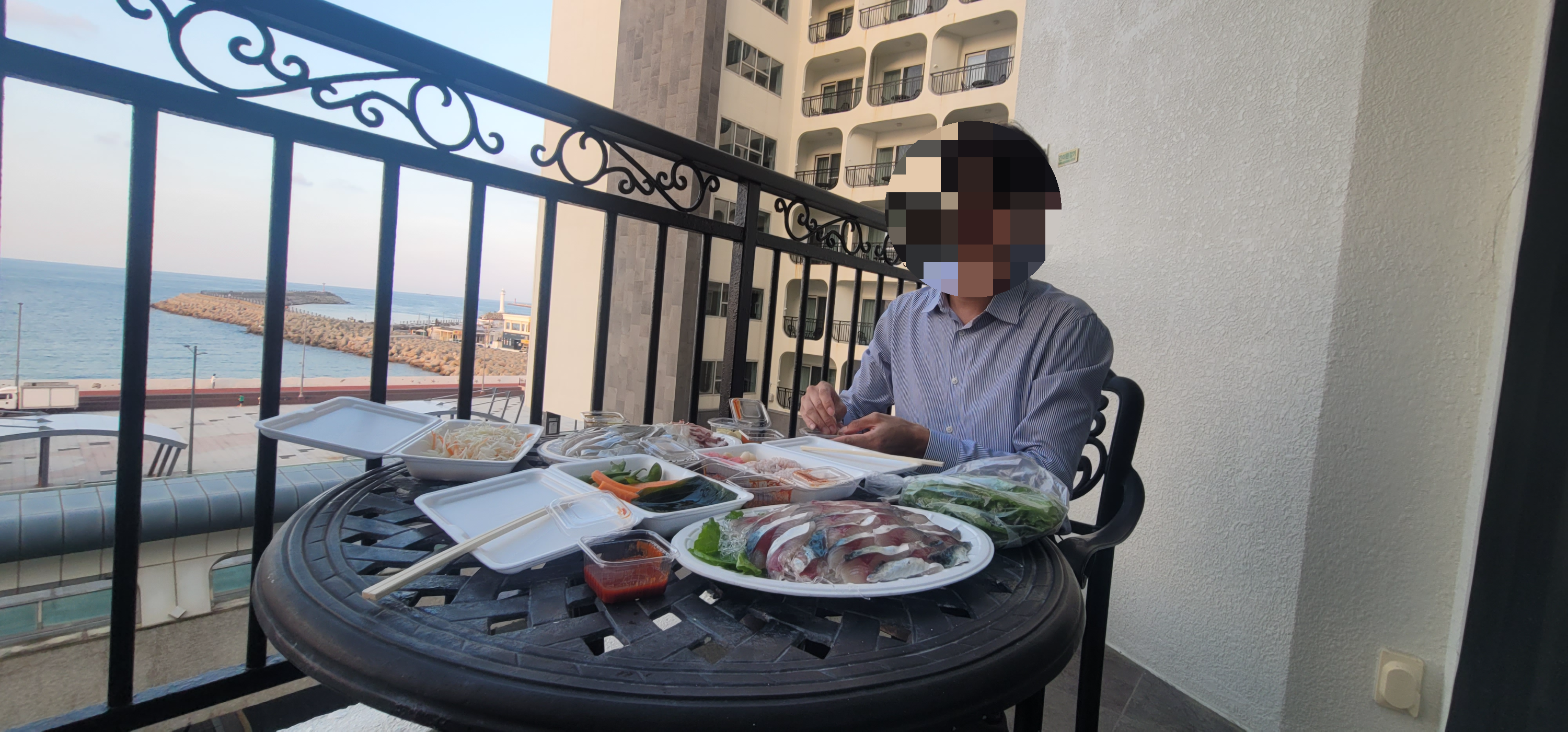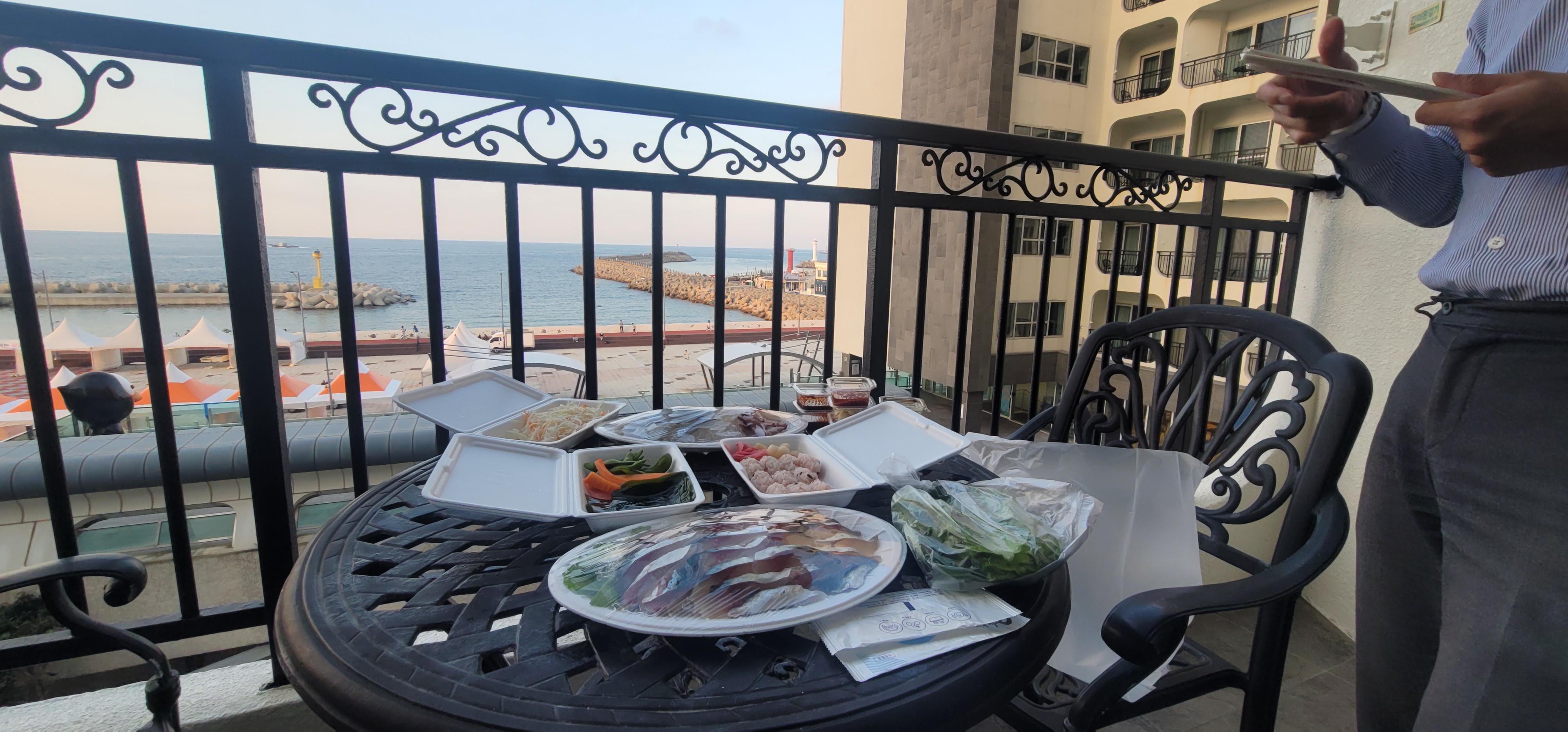 호텔 테라스에서 바다를 바라보며 먹는 고등어회!