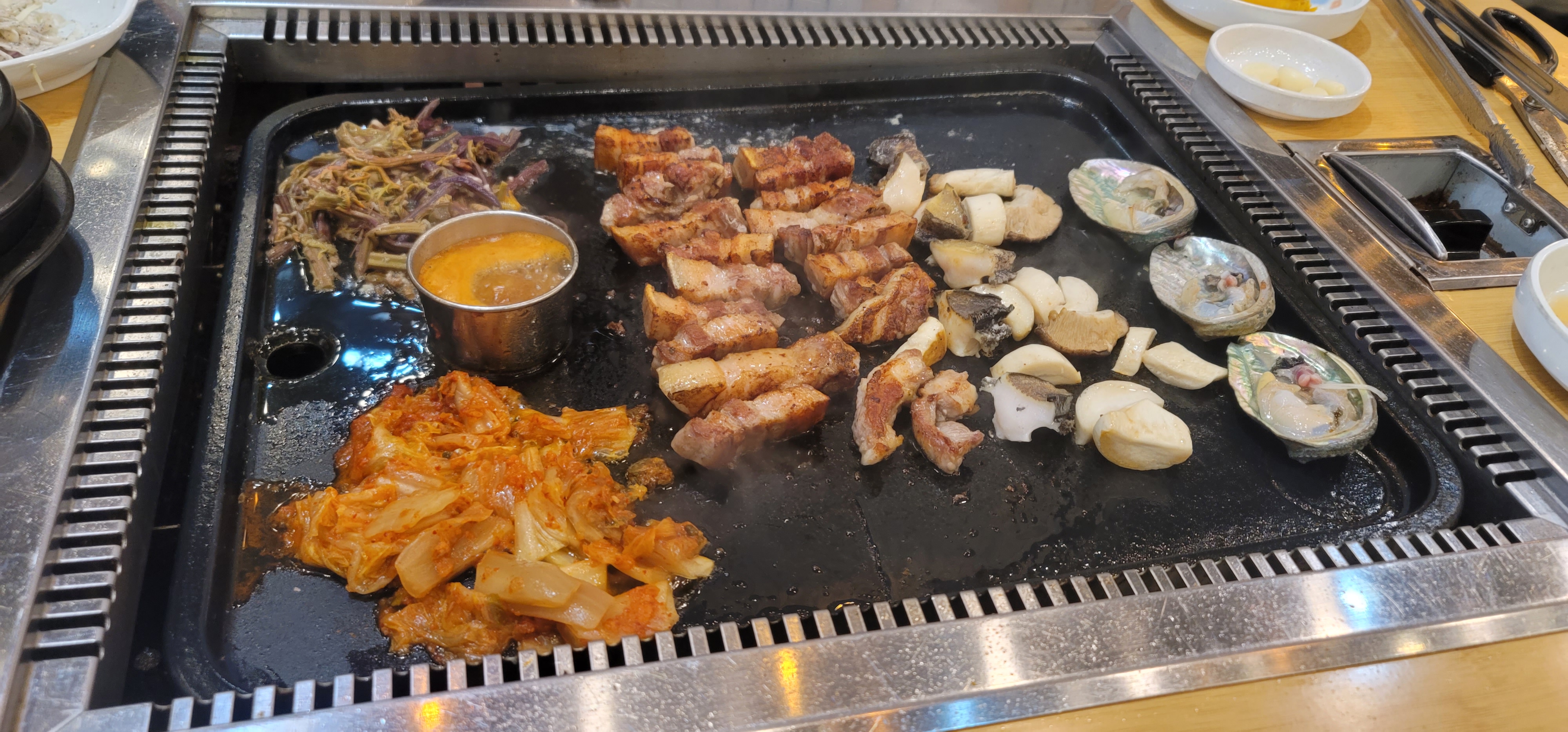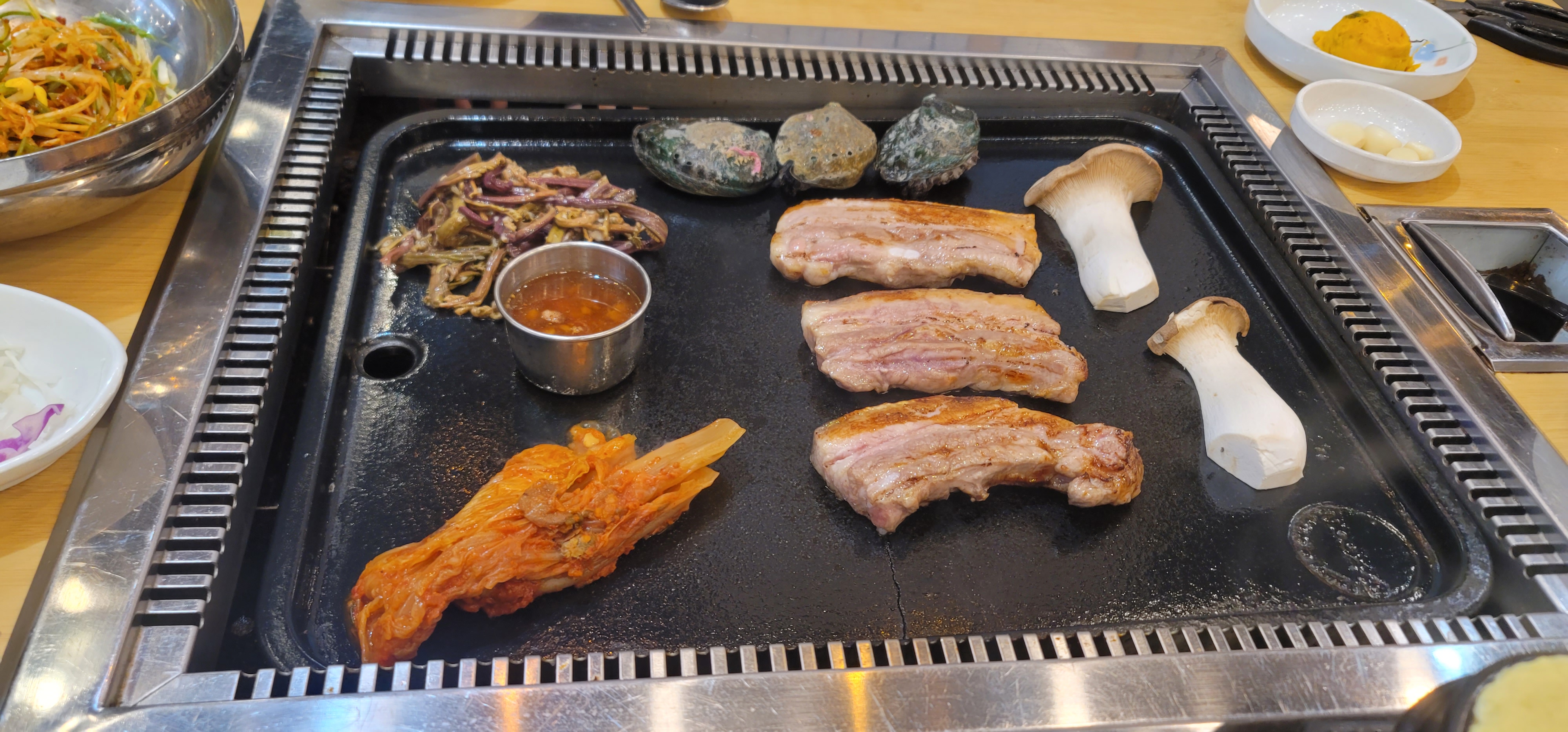 전복이랑 삼겹살 조합은 처음인 것 같은데 쫀득쫀득한 식감과 고기의 식감이 어우러지더라구요.