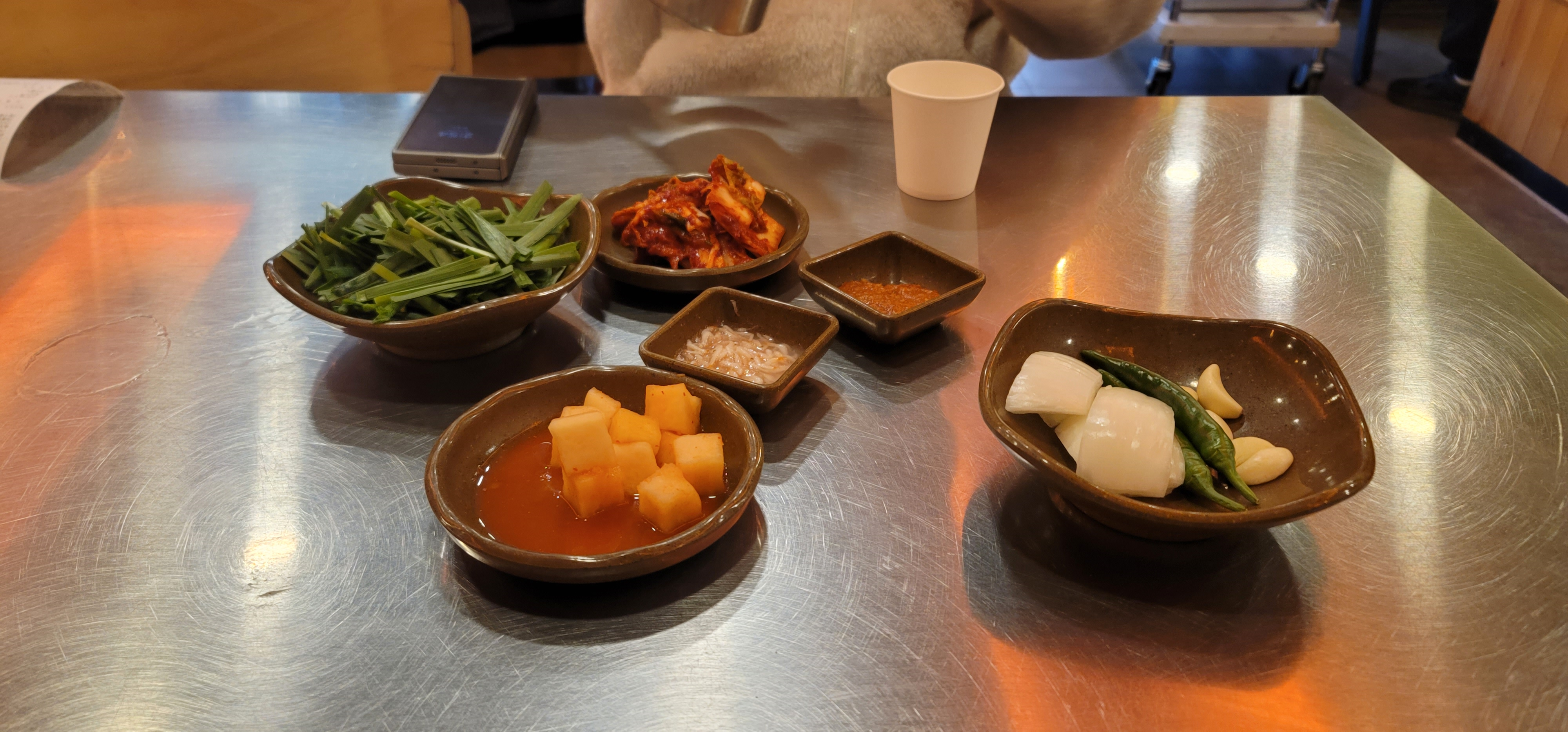 깍두기, 김치, 부추, 새우젓, 고추, 양파, 마늘이에요.