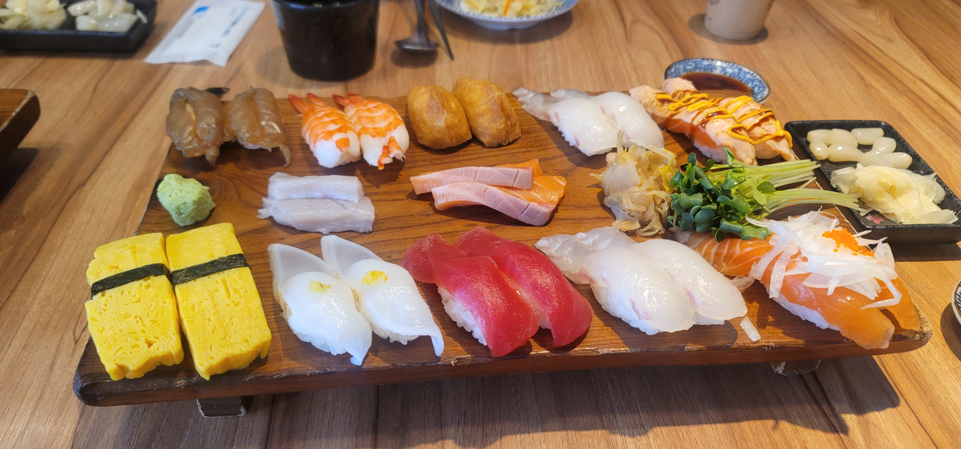 계란초밥, 연어초밥, 광어초밥 등 종류가 다양했어요.