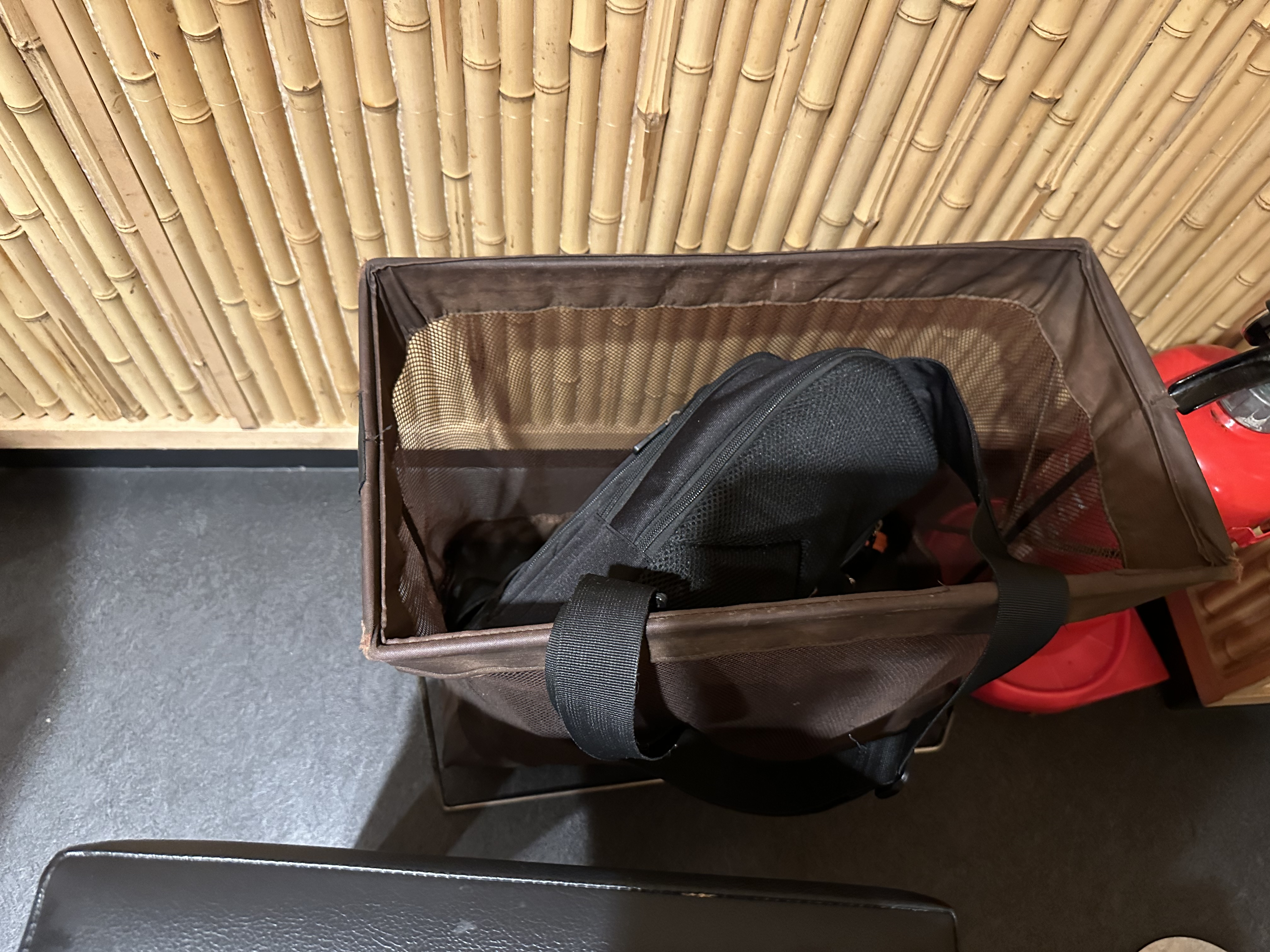 평소 걱정이 많은 편이라 그냥 메고 먹었겠지만 뒷편이 벽이고 끝쪽이라 그냥 넣었다.