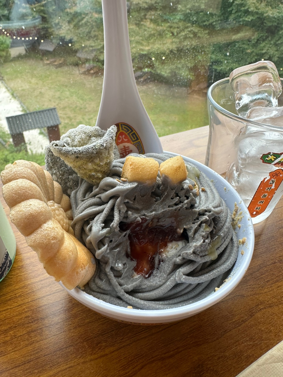 막국수 모양을 내기 위해 가느다란면으로 내려진 아이스크림은 몽블랑 느낌이 나면서 흑임자맛이 진하게 나서 맛있었어요.