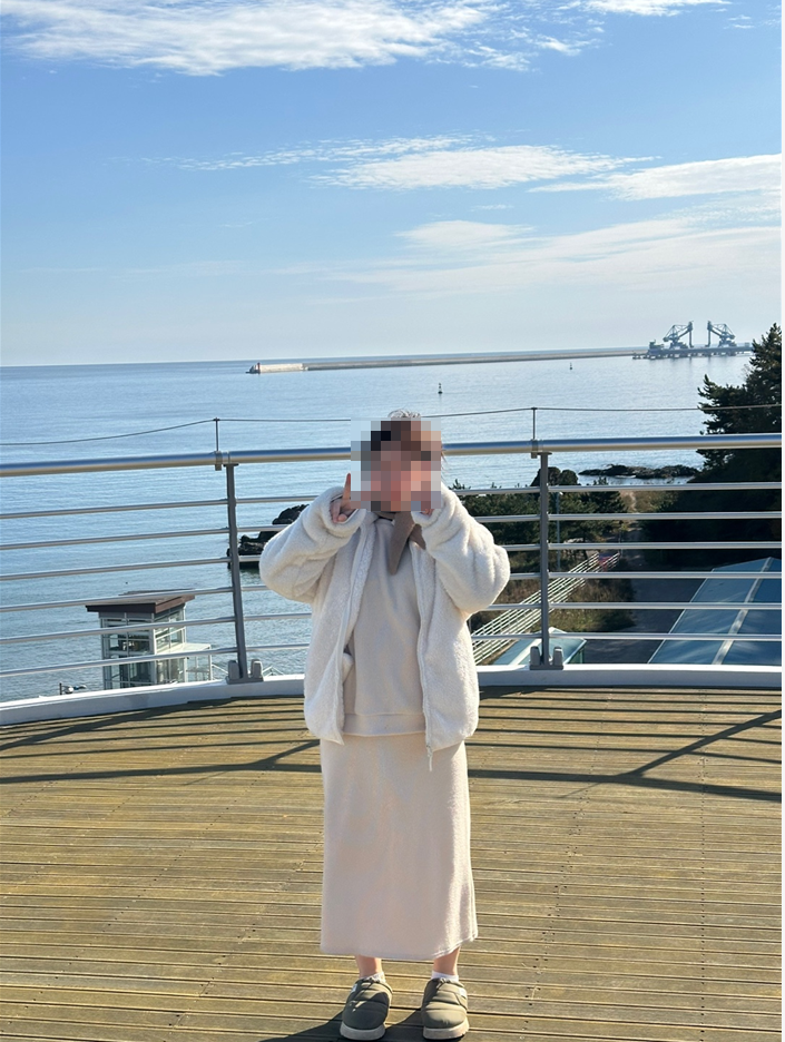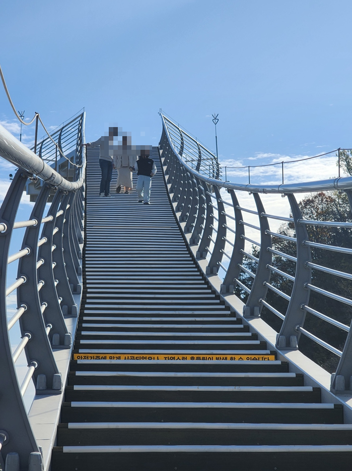 남편과 나는 중간 지점까지 올라가 보았는데, “바람에 흔들릴 수 있다”는 말이 과장이 아니었다. 실제로 약간 흔들리는 걸 느끼니 두근거리면서도 스릴이 있었다. 그러나 그 흔들림 덕분에 바다 위에 떠 있는 듯한 느낌이 들었고, 멀리 보이는 삼척 바다의 수평선과 파도, 그리고 해안선이 마치 한 폭의 그림처럼 펼쳐졌다.