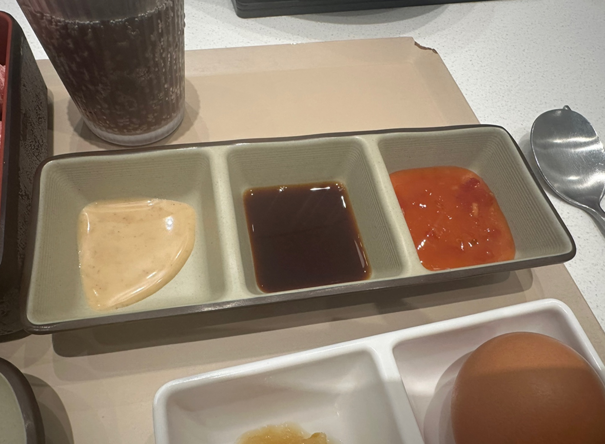 우리는 테이블에 앉았고 자리마자 다양한 소스가 비치되어 있어 취향껏 먹을 수 있다.