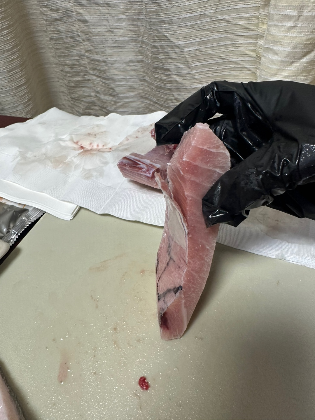 해동지에서 물기를 빼고 참치를 썰어내면 끝이다.