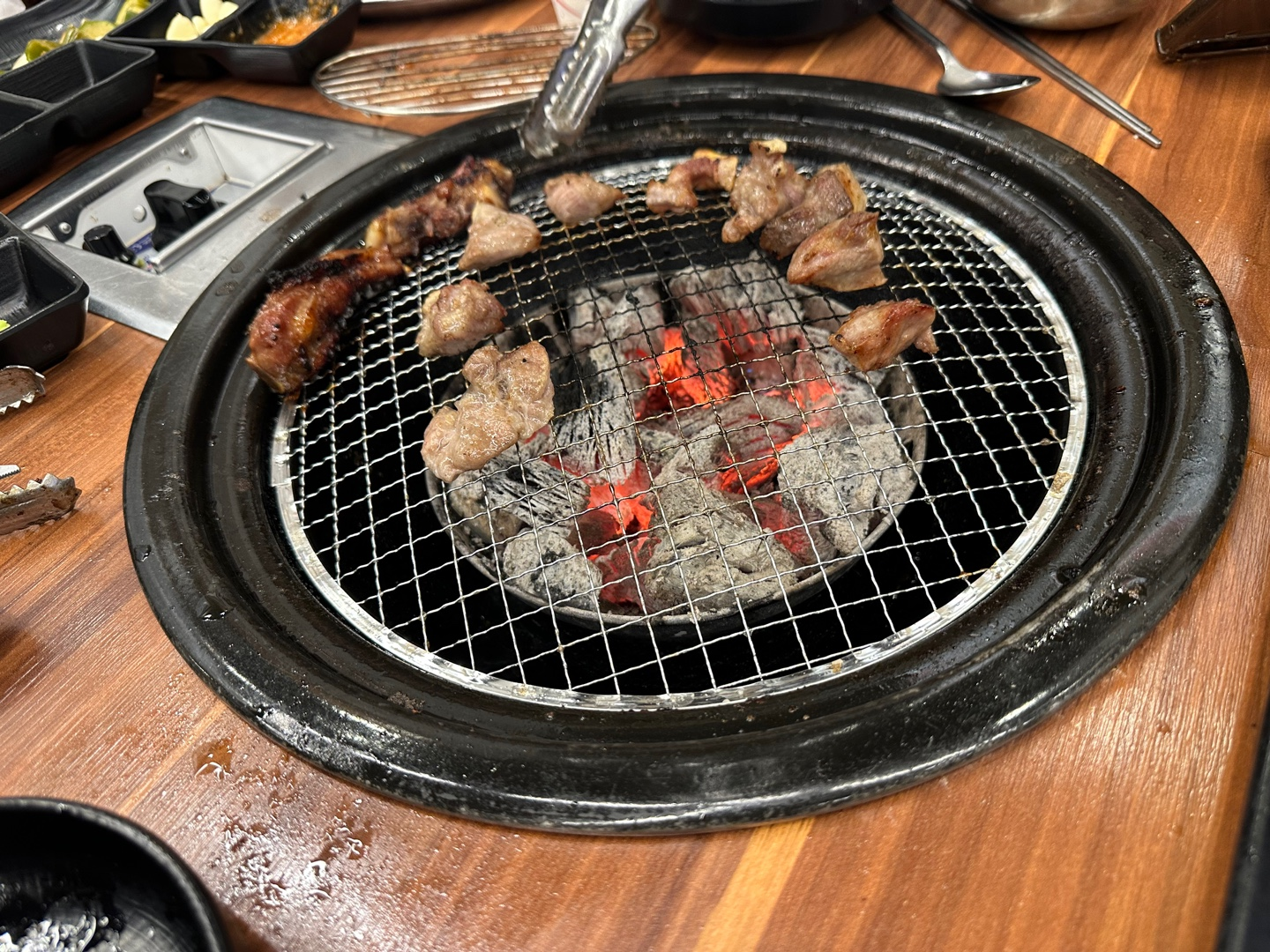 고기는 숯불에 구워 불향이 은은하게 배어 있었고, 식감이 부드러워 입에서 살살 녹는 느낌이었다. 특히 좋았던 점은 소금, 쌈장, 다양한 양념장이 준비되어 있어 각자 취향에 맞게 골라 먹을 수 있다는 점이다. 고기 종류에 따라 소금만 찍어 먹거나, 양념장을 바꿔가며 먹는 재미가 있다.