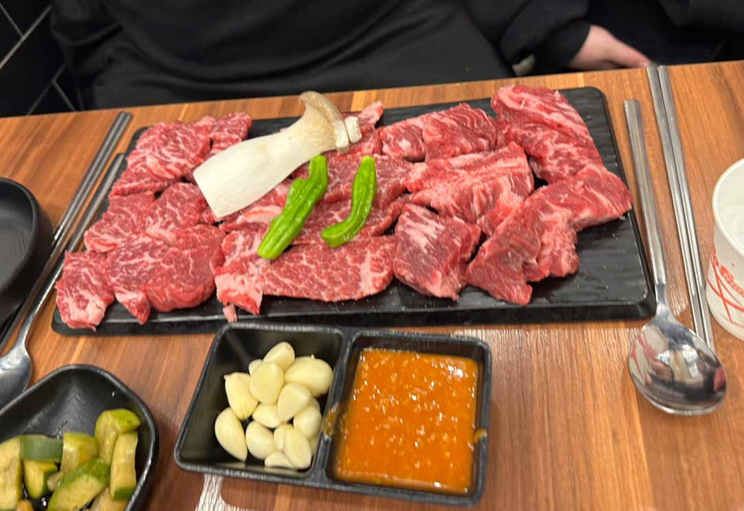 처음에는 소고기 세트메뉴로 주문했고, 이후에 돼지갈비와 소고기 특수부위를 단품으로 추가했다. 인원수가 있다 보니 여러 부위를 다양하게 먹어볼 수 있어 좋았다.