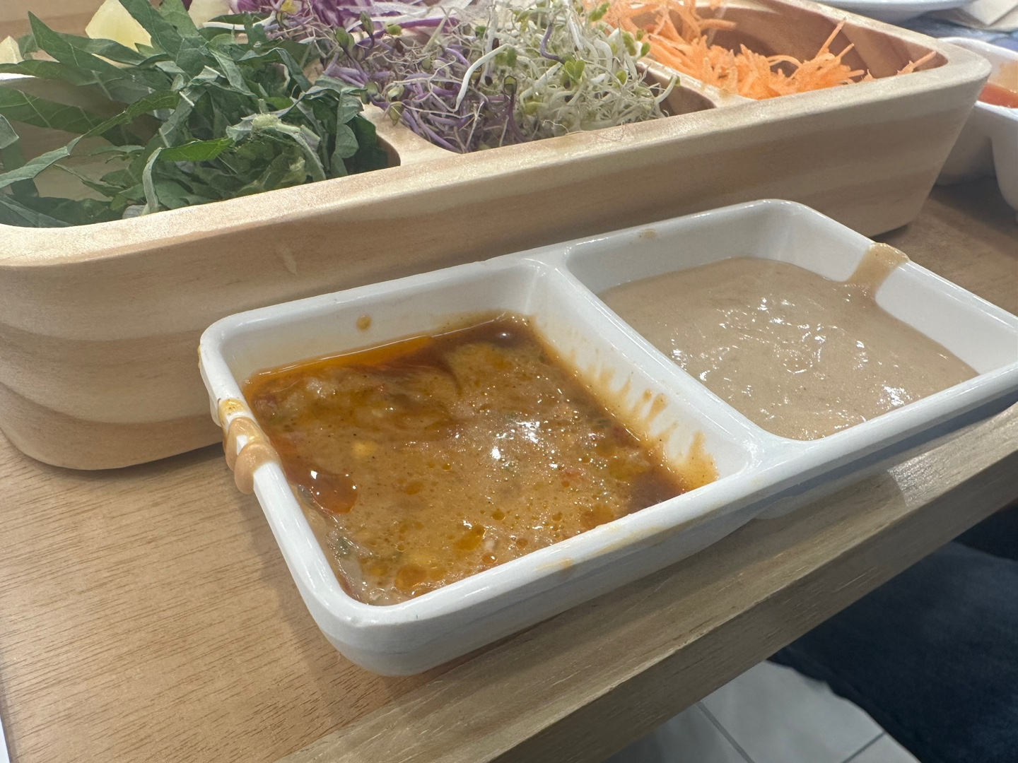 근데 입구가 넓고 찍어먹기 좋아서 편했다. 그리고 샤브샤브에 마라소스가 잘어울려서 남편이랑 나는 이 소스에만 찍어먹었다.