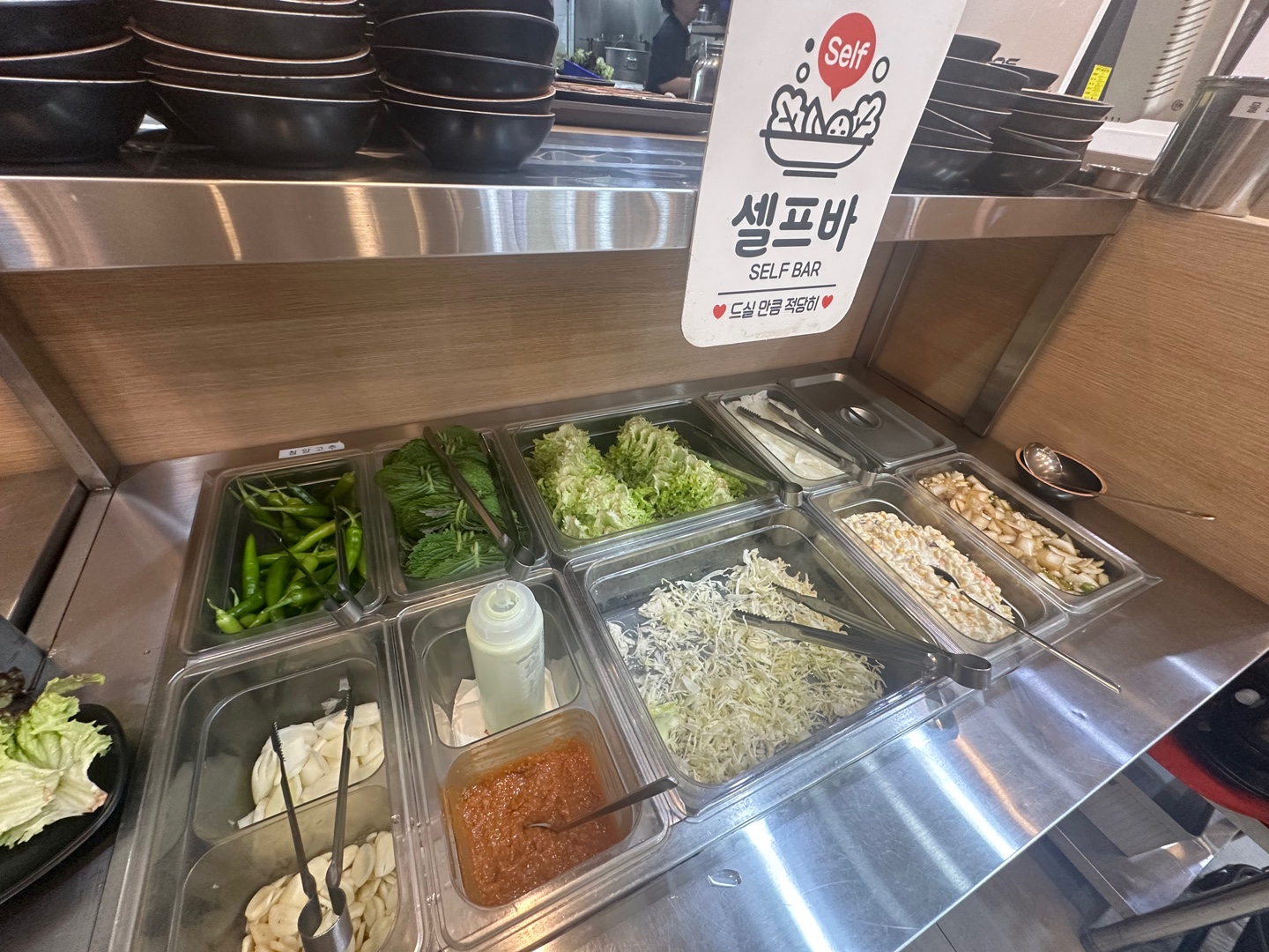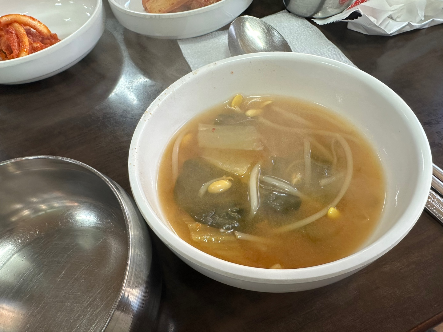 기본으로 쌈무, 시원한 콩나물국, 양파장아찌, 쌈 채소가 정갈하게 세팅되요.
